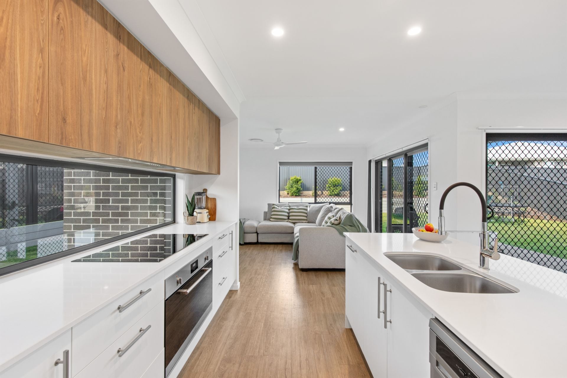 • Designer kitchen with stone benchtops, breakfast bar, electric cooktop, dishwasher, and large walk-in pantry with integrated laundry – the heart of the home